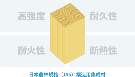 主な構造部には、品質や強度が安定している「構造材」を採用。強度にばらつきがある一般的な木材に比べ、「構造材」は、性質の異なる木の部位を切り分けて接着するため、安定した品質や強度を実現します。さらに、無垢材と比べると、1.5倍の強度を持ち、曲げや、たわみに強いことも特長のひとつ。日本農林規格(JAS)によって定められた構造基準をクリアした、高強度で、耐火性・耐久性・断熱性に優れた木材です。