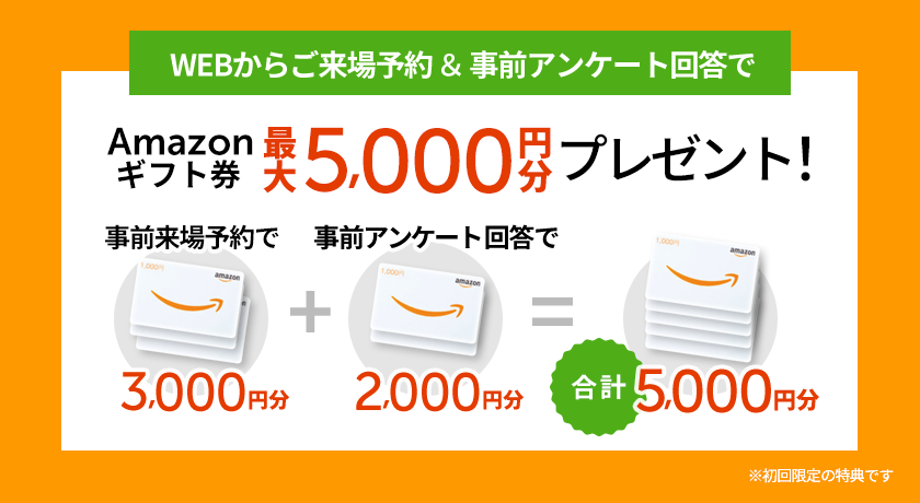 期間中に、WEB予約&ご来場で特典が通常の3倍!アマゾンギフトカード3,000円分をプレゼント!さらに、ご予約後、簡単なアンケートのご回答でプラス2,000円分を進呈!特典が最大5,000円分にグレードアップ!