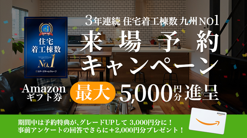 | 開催内容 | 期間中、シアーズホームの住宅展示場へ、事前予約をしてご来場いただくと、アマゾンギフトカード3,000円分をプレゼントいたします(通常1,000円分の特典が期間限定で3倍に増量中です!)さらに、ご予約後、簡単なアンケ―トのご回答で+2,000円分を進呈!特典が最大で5,000円分にグレードアップ! |