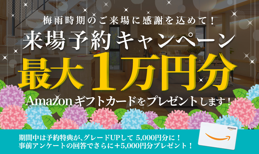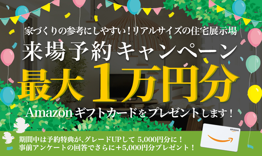 展示場の来場予約は今がおすすめ!初回限定の来場特典としてAmazonギフトカード5,000円分進呈!さらに予約後、簡単なアンケートに回答するとプラス5,000円分もらえる!