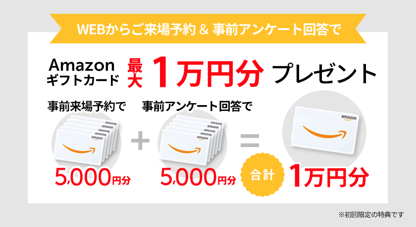 はじめての方限定のご来場特典としてAmazonギフトカードをプレゼント!さらに、ご予約後簡単なアンケートにご回答いただくと、ご来場特典をグレードアップ!
