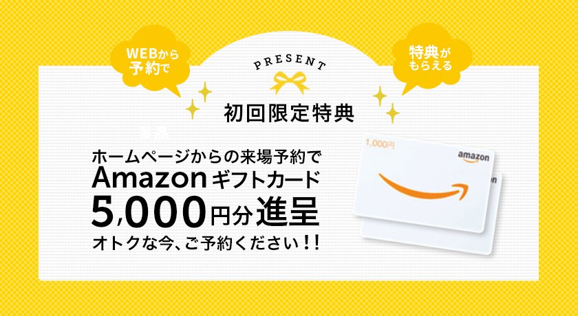 | 注意事項 | ※アマゾンギフトカードプレゼントは、シアーズホームの展示場に、初めてお越しの方が対象です。これまでに、シアーズホームの展示場にお越しいただいたことのある方は、特典の対象外となります。 ※ご来場予定の前日18時までにWEBよりご予約をいただいた場合に限ります。 ※枚数に限りがございます。なくなり次第終了となります。ご了承ください。 ※特典プレゼントは、熊本県内で新築をご計画中の方に限ります。 ※特典やサービスご利用の際は、弊社アンケートへのご記入、ご協力をお願いいたします。 |