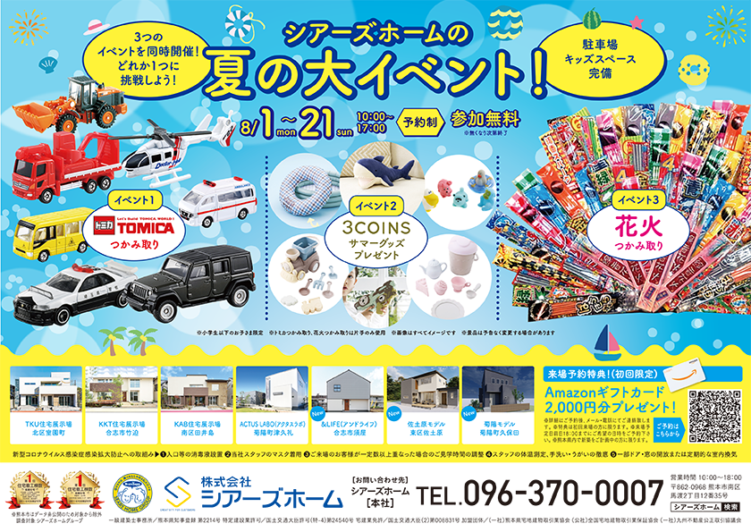8月1日(月)~21日(日)の期間中に、モデルハウスにご来場頂き、ご見学&アンケートにお答え頂くと、「トミカつかみ取り」or「3coinsサマーグッズプレゼント」or「花火つかみ取り」のいずれかに挑戦いただけます。