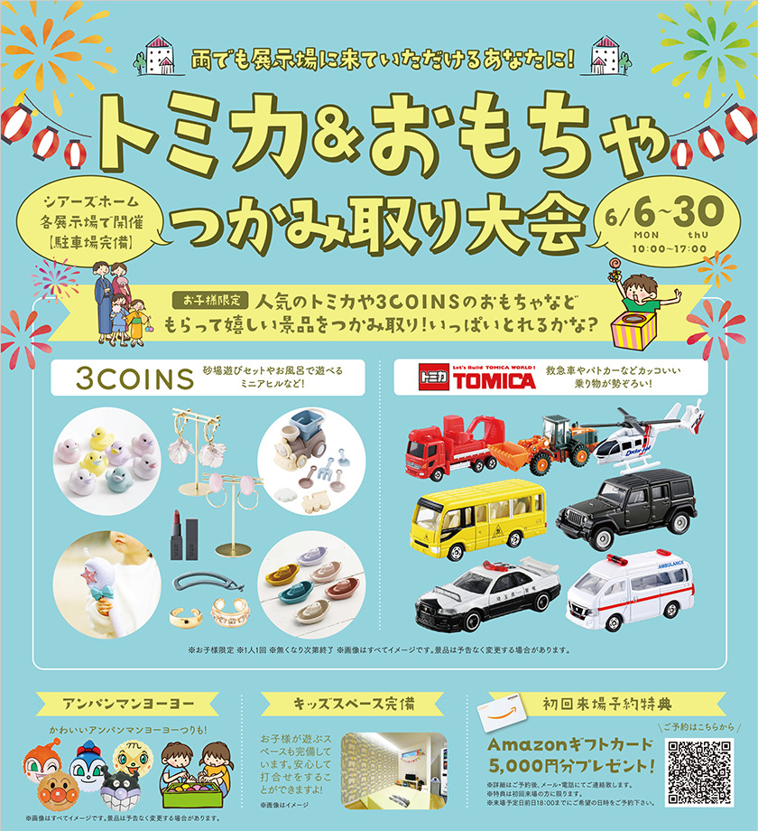 6月6日(月)~30日(木)の期間中に、モデルハウスにご来場頂き、ご見学&アンケートにお答え頂くと、人気のトミカや3コインズのおもちゃやヘアアクセサリーなど、もらって嬉しい景品が多数の「つかみ取り大会」にご参加いただけます。かわいいアンパンマンヨーヨーも!