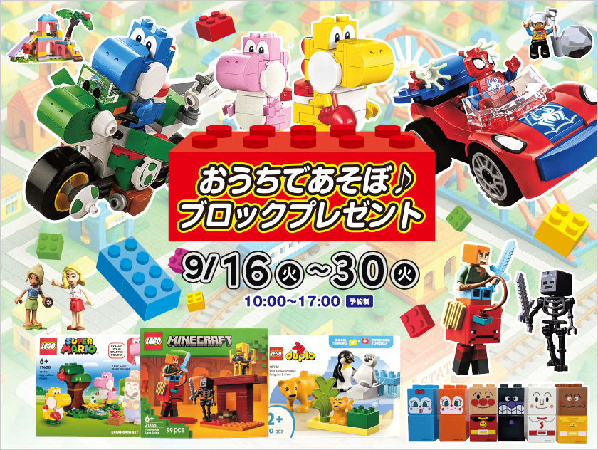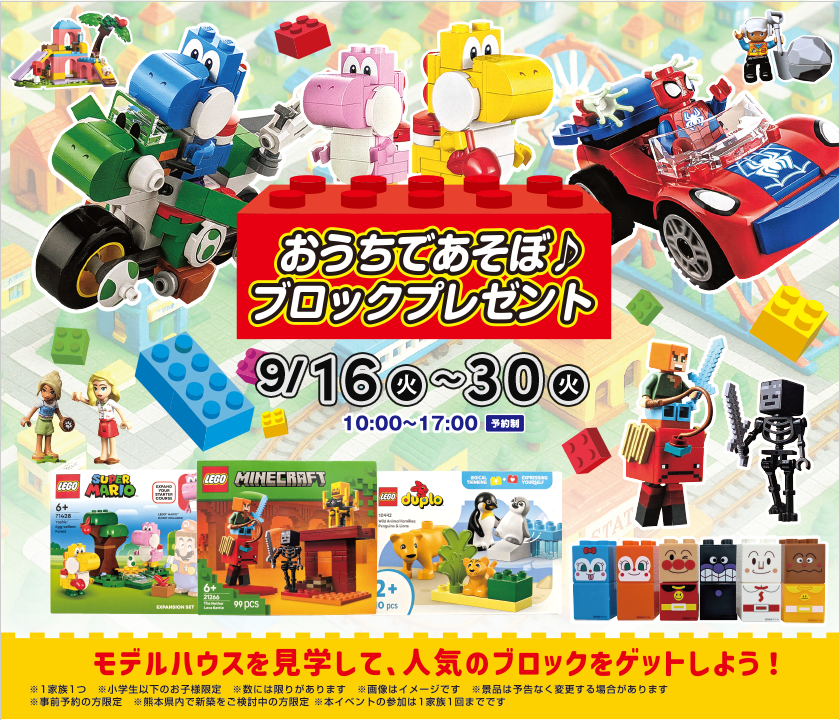 9/16(火)~30(火) おうちであそぼ♪ブロックプレゼント。モデルハウスを見学して人気のブロックをゲットしよう!