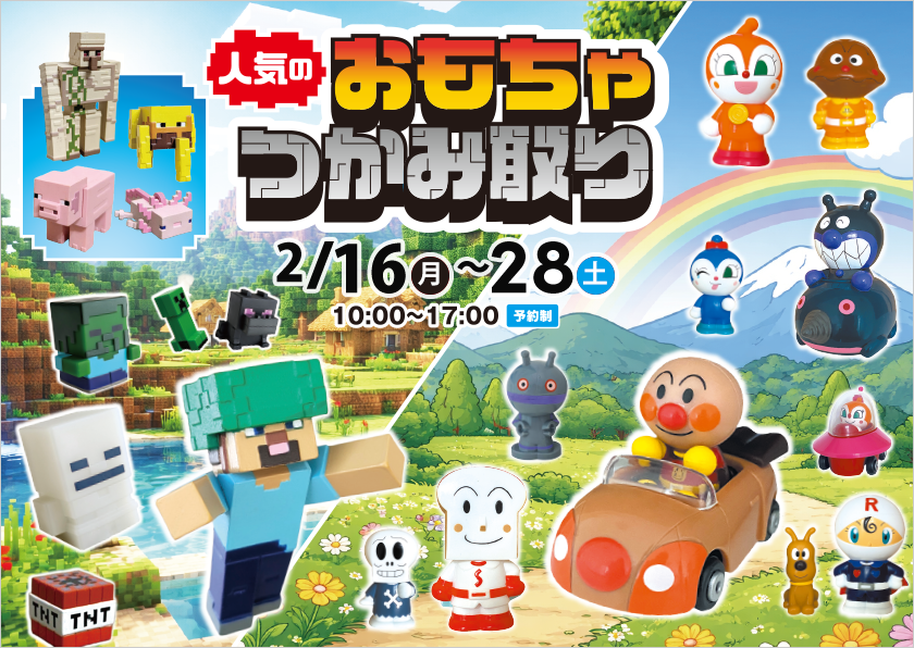 アンパンマンとマインクラフトのおもちゃがいっぱい!いくつとれるかな!?アクタスラボのモデルハウスを見学して、人気のおもちゃつかみ取り大会に参加しよう!展示場で待ってるよ!