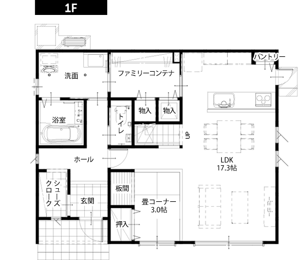 熊本市北区楠のまちなかモデルハウス。共働き夫婦におすすめの家事ラクの家事動線の間取り。ファミリーコンテナやパントリーなど、家事動線を考慮した収納や、雨天時に活躍する室内干しスペースなどアイデアが満載の36坪3SLDKのモデルハウスです。
