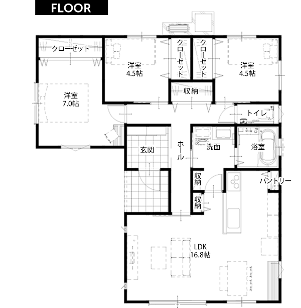 平屋に不足しがちな収納スペースは、空間を有効活用し、LDK、洗面、廊下、各部屋にしっかり完備。